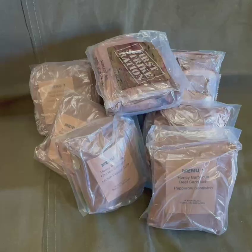 Honey BBQ Beef Sandwich; Chicken Chunks; Lemon Poppy Pound Cake; Tortillas; Cheese Spread; Crackers; Dessert Bar, Chocolate Banana Nut; First Strike Bar, Mocha; First Strike Bar, Cran-Raspberry; Corn Nuts; Zapplesauce; Nut Fruit Mix; Beverage Base x 2 Caffeinated mints; Mayonnaise; Hot Sauce; Accessory packet |